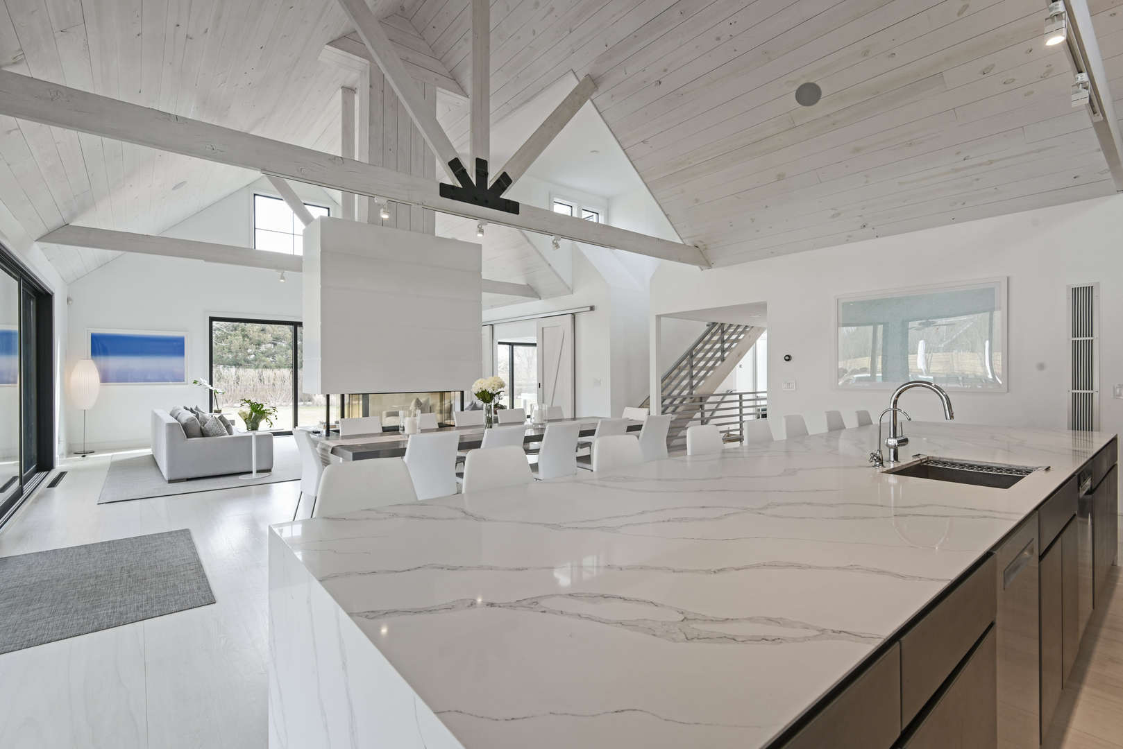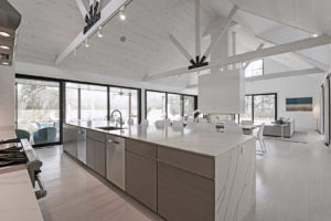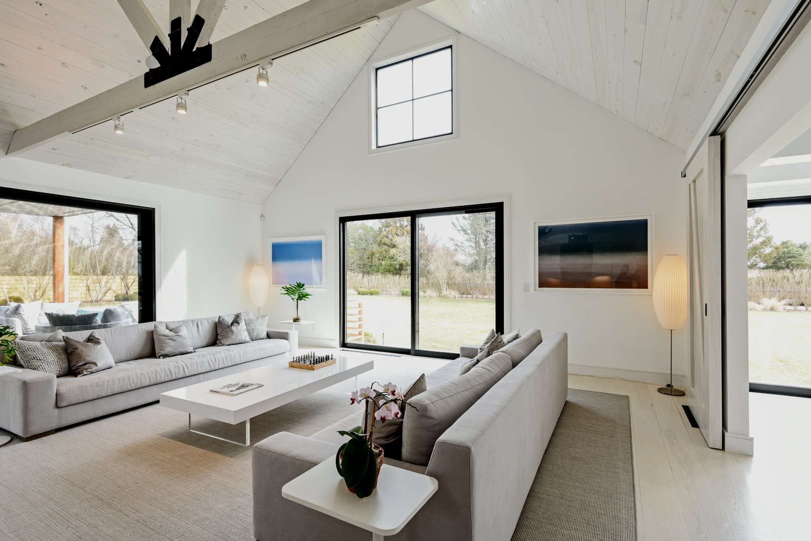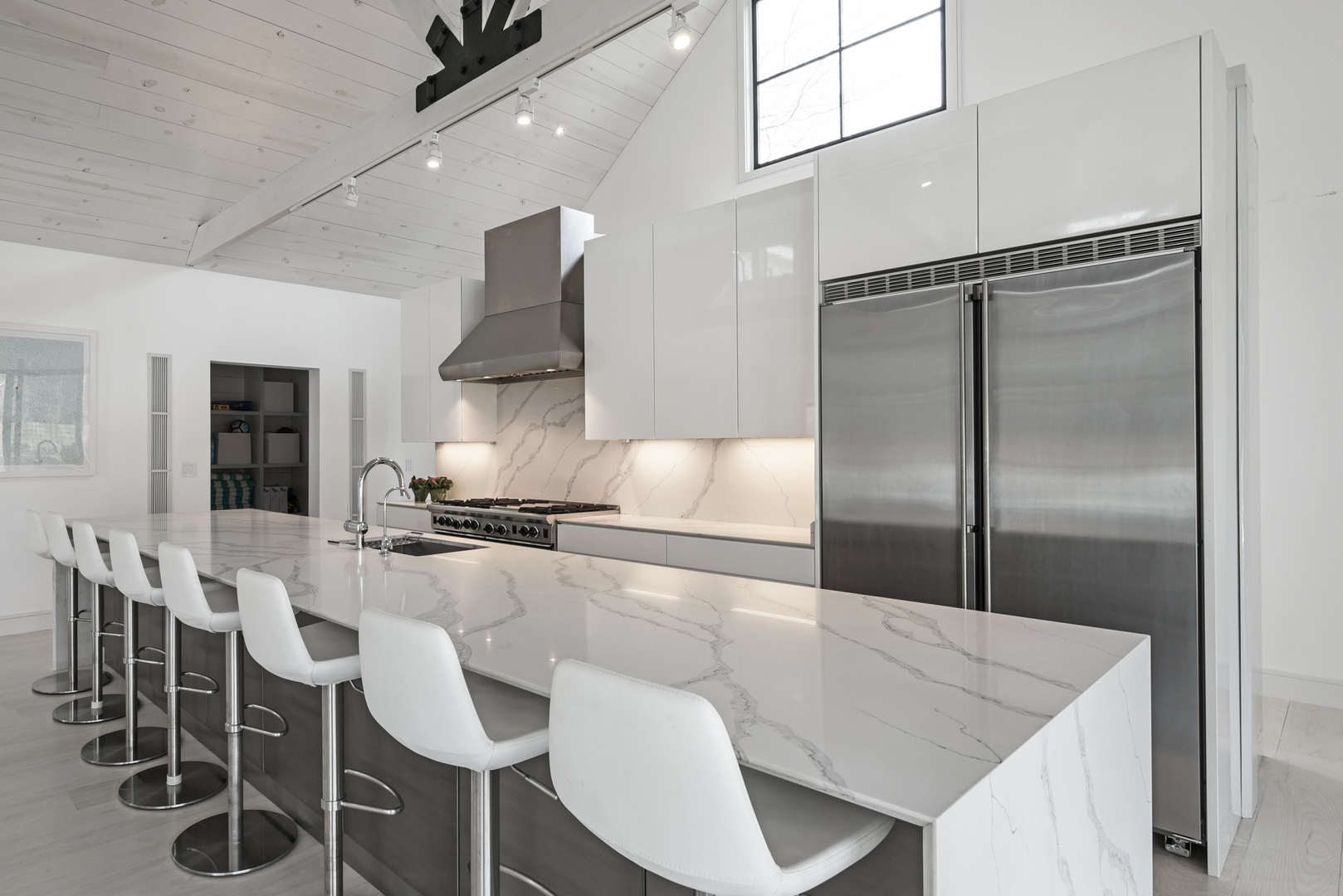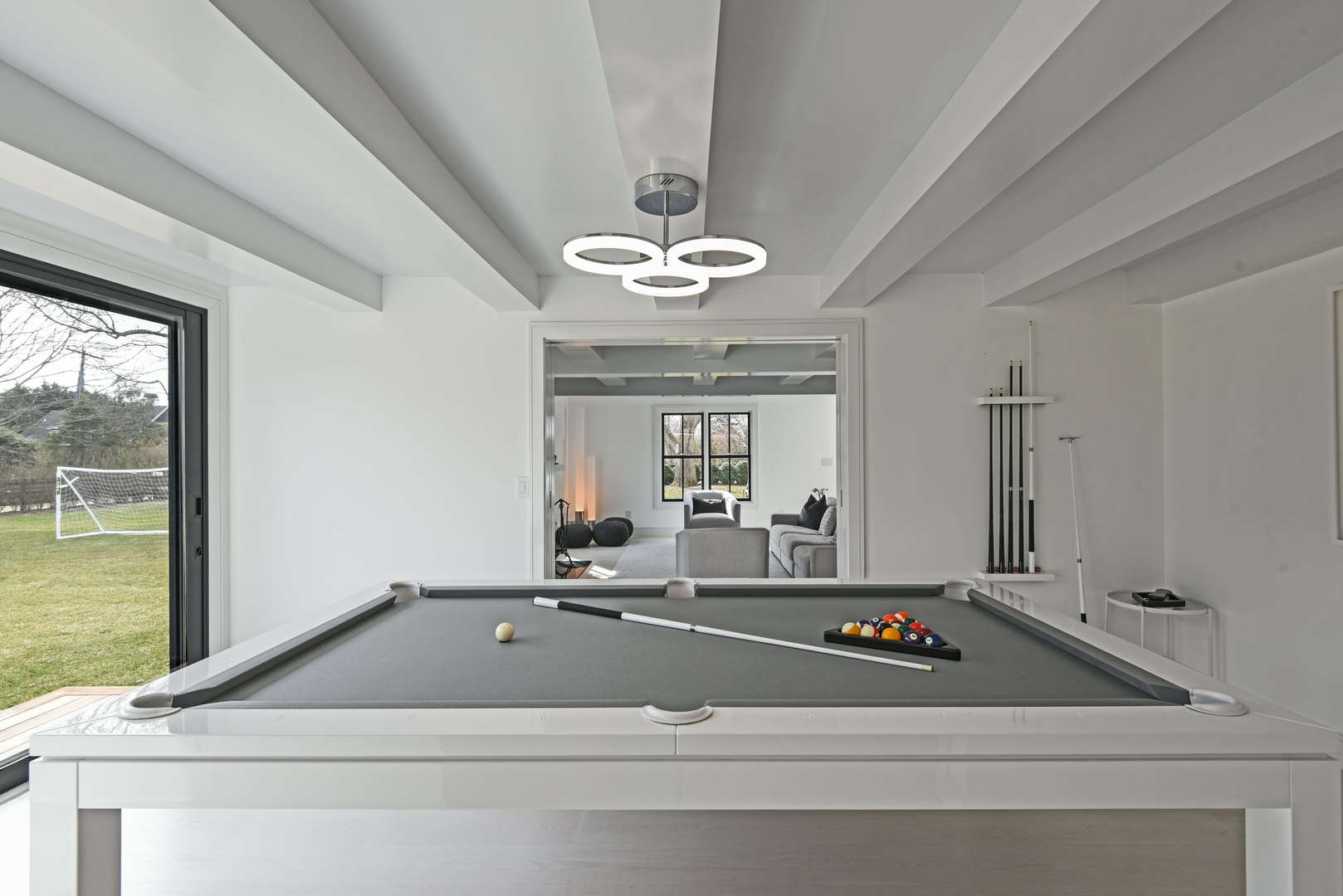 Adding 3000 sq. ft. to this home converted the existing structure into a Modern Barn®. Doubling the size of the house achieving a seven bedrooms and six and a half bathrooms. The Barn Room, houses a new kitchen with a 16’ kitchen island and dining area opening onto the covered deck. Behind the kitchen, is lined with pantry storage closets and 2 beverage coolers. The new lower level boasts two new bedrooms en-suite, a gym, and a rec room.
